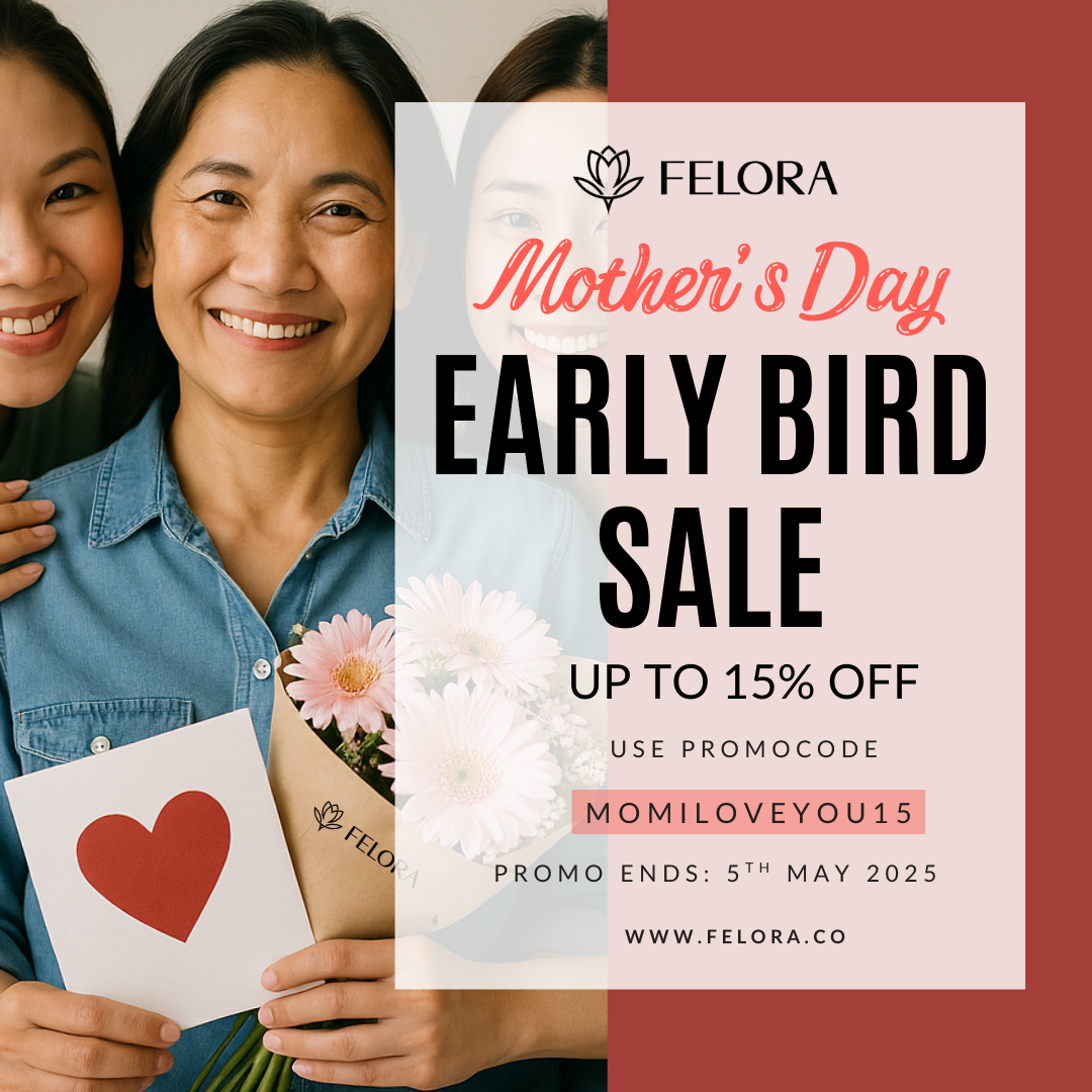 Motherâs Day is just around the corner on 11 May. Plan ahead and enjoy 15% OFF our specially crafted Motherâs Day bouquets with early bird pre-orders.